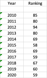 There clearly has been a change in the last 10 years, a change for the better. If 10 years ago the ranking ranged between 85-95, in recent years it has ranged between 55-65. Roughly speaking, once can argue that Greece improved its ranking by about 30 points in the last decade.